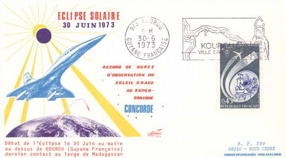 June 30, 1973, supersonic Concorde is transformed into an observatory, used by scientists to photograph the total solar eclipse while flying over North Africa. She has, thanks to its speed and extreme stability, allowed the unequalled observation of a total eclipse.. Thus the usual time of observation is multiplied by ten. 8 minutes long seen from the ground, it lasts 81 minutes seen from the supersonic! This event inserts automatically the Concorde in the SPACE related collection.