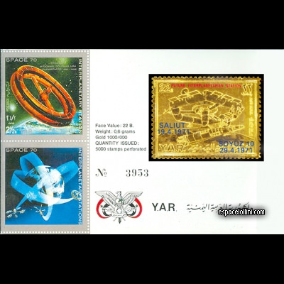 Descriptif : Carnet avec timbre en or 4500 YAR 19 H surchargé en bleu SALIUT / 19.43.1971 / SOYUZ 10 / 29.4.1971 Informations valeurs :