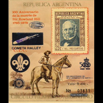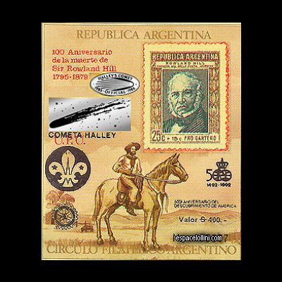 Méthode d’impression: offset Descriptif : Cométe de Halley en surcharge argent sur bloc Hill, Rotary et scoutisme, anniversaire des 500 ans de l`Amérique. Scan difficile l surchare est en encre argent, reflete la lumière, apparait noire. Informations valeurs :