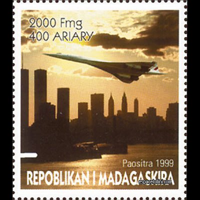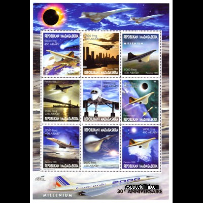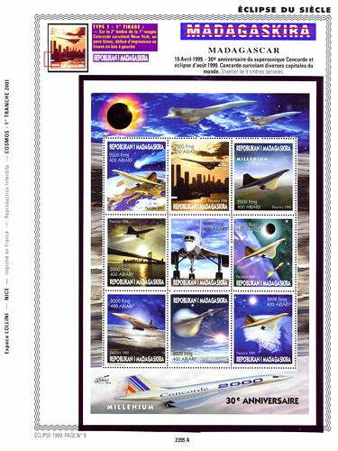 Printing method: offset Description : Eclipse 1999 and 30th anniversary of Concorde. Type 1. The subjects in the series “MEANS OF TRANSPORTATION” from Madagascar have been chosen, starting from the drawings of the 1st upgrade 2000 from the Concorde Album, and from the re-edition of Volume 1 Concorde , now in full color. It was the occasion to test the 3D computer model of Concorde created in summer 1999 by Alexandre Lollini. Our workshops are now equipped so as to represent the concorde in ANY CONFIGURATION AT ALL so as to illustrate your albums, or be able to create postage stamps.
