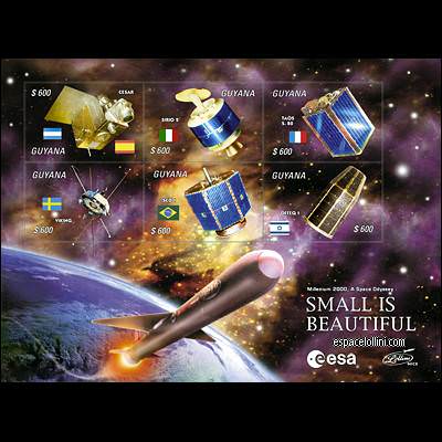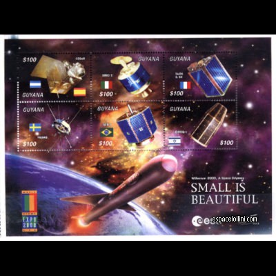 Description : 2nd set. Anaheim World Stamp Expo, Small is beautiful, the international micro-satellites. Sheetlet of 6 stamps. Values information :
