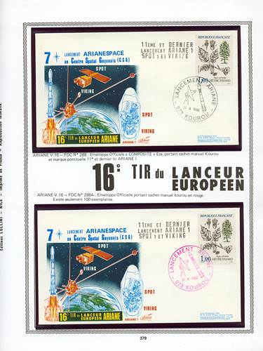 autographe?: non - noneBeskrivning : ESA composite with red Kourou post stamp. Composite cover dedicated to the last Ariane 1 launch, showed with the 2 satellite Spot and Viking. Nyckelord : #Ariane, #ESA, #LOLLINI (design), #Planet, #Raket, #Satellit, #Telekommunikation, Artikel i en Katalog. Senast ändrad: 19/11/2015 @ 23h16