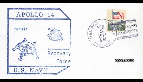 Descriptif : Cachet manuel USS Ponchatoula AO 148. Type Ravitailleur. Flotte Pacifique de récupération de la mission Apollo 14.