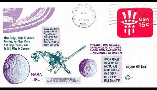 Cachet postal de Pasadena et photo de Tethys. Mot(s)-clé : #Espace profond, #NASA, #Planète, #Sonde, Ceci est EN DEHORS des Revues de l’Espace. Dernière modification: 23/05/2015 @ 10h52