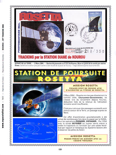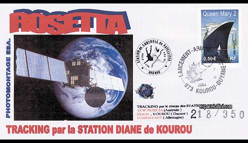 Descriptif : Kourou et station Diane. Numéroté. Sonde Rosetta, enveloppe Tracking depuis la station de controle et satellite Diane à Kourou.