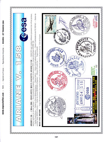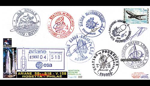Descriptif : Maxi numéroté. Kourou et 5 cachets des centres ESA de tracking, signatures des chefs de station. Rosetta constitue un projet phare pour l`ESA qui y a investi plus d`un milliard d`euros. Le comité scientifique européen a décidé sa construction en 1993, après l`abandon d`un projet commun avec la NASA, avec l`objectif d`améliorer notre connaissance du processus de formation du Système solaire dont les comètes constituent des vestiges.