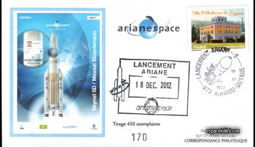 autographe?: non - noneDescriptif : ARIANESPACE. Kourou + Cachet de lancement à Date. Numéroté. 7e et dernier tir de l`année, 53e succés d`Ariane 5. Dernier Skynet lancé, 5 ans après le précédent. Mot(s)-clé : #Ariane, #Drapeaux, #ESA, #Fusée, #Planète, #Satellite, #Telecommunications, REVUE DE L’ESPACE : 05 - 2015 Dernière modification: 29/02/2016 @ 15h12