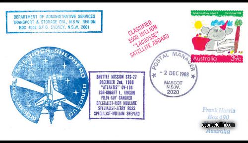 autographe?: non - noneDescrizione : Sydney tracking station, Mascot post stamp. Red Lacrosse stamp and blue stamp of mission insignia. Parola chiave : #Razzo, #Satellite, #Space Shuttle, RIVISTA DELLO SPAZIO : 02 - 2015 Ultima modifica: 31/07/2015 @ 16h13