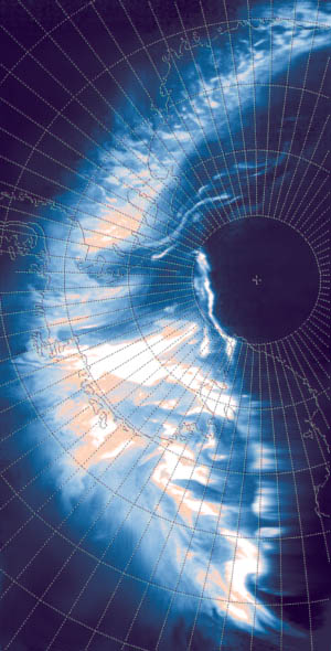 A gauche : Réparition des aurores boréales autour du Pôle Sud.